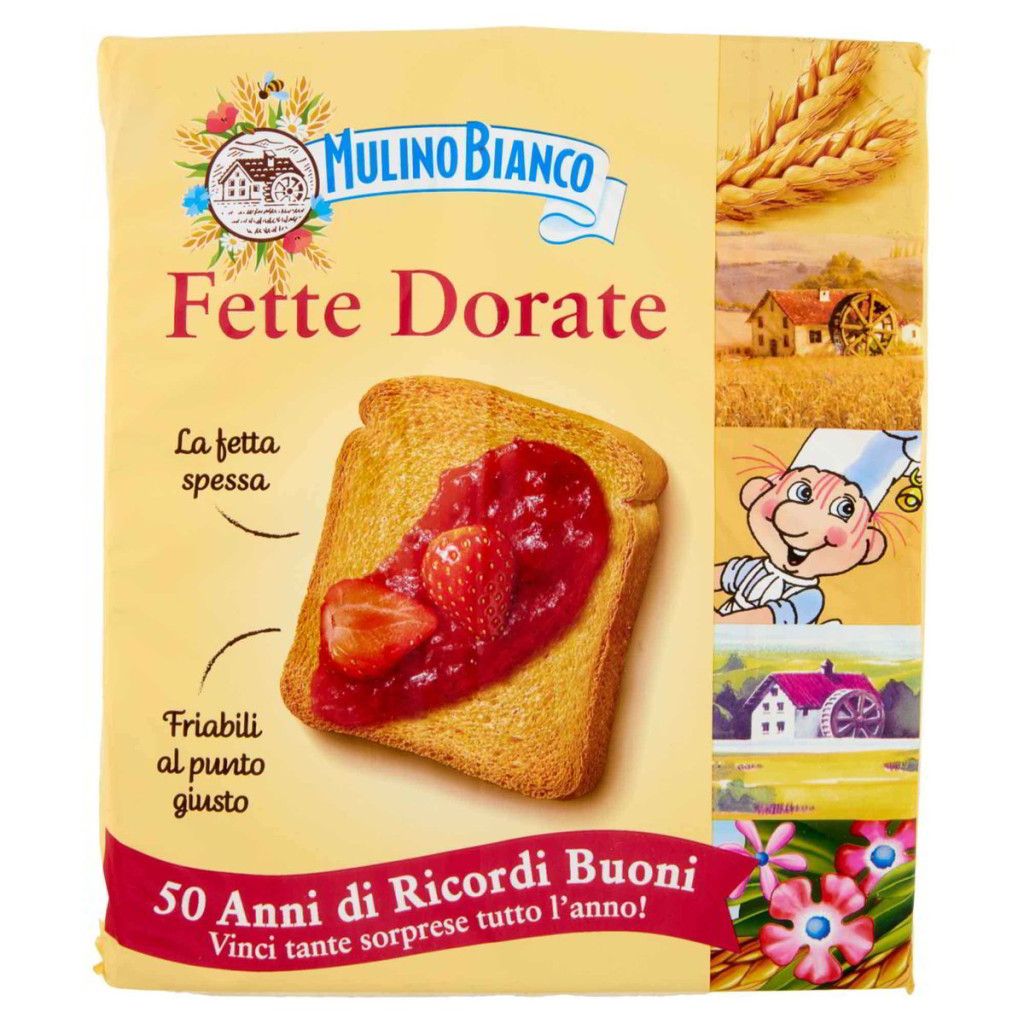 A Mulino Bianco Fette Dorate az olasz reggelik ikonikus szereplője. Ez a különleges kétszersült titka az egyszerűségében és a minőségében rejlik: gondosan válogatott búzalisztből készül, majd lassú sütéssel nyeri el jellegzetes, étvágygerjesztő arany színét és páratlanul ropogós textúráját.